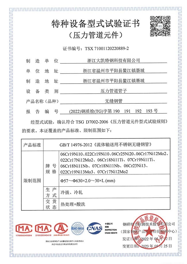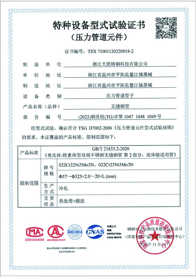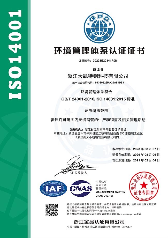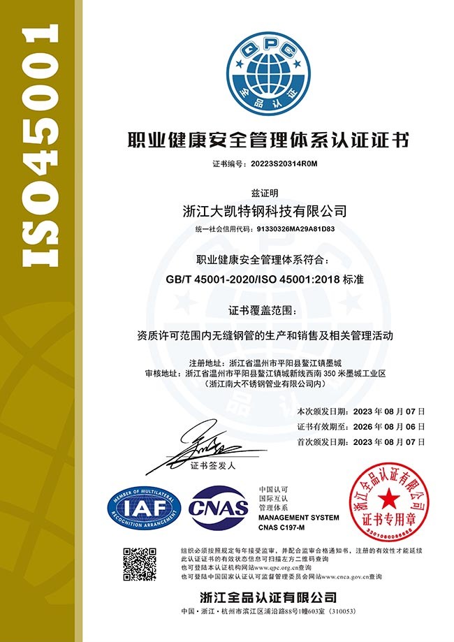 浙江大凱特鋼科技有限公司,原(浙江大凱不銹鋼有限公司)坐落于浙江省溫州市平陽縣鰲江鎮墨城工業區,營銷中心坐落于溫州市龍灣區海濱街道直上路工業園區1號,工廠占地75畝。專業生產不銹鋼,并經營各種材質的圓鋼、無縫管、焊管、緊固件(螺絲)、方管、槽鋼、角鋼、板材、法蘭、彎頭、封頭、閥門、藥機(罐)、塊狀卡壓式水管等業務。現擁有4臺穿孔機組、16臺冷軋機組、12臺冷拔機組等先進生產設備。